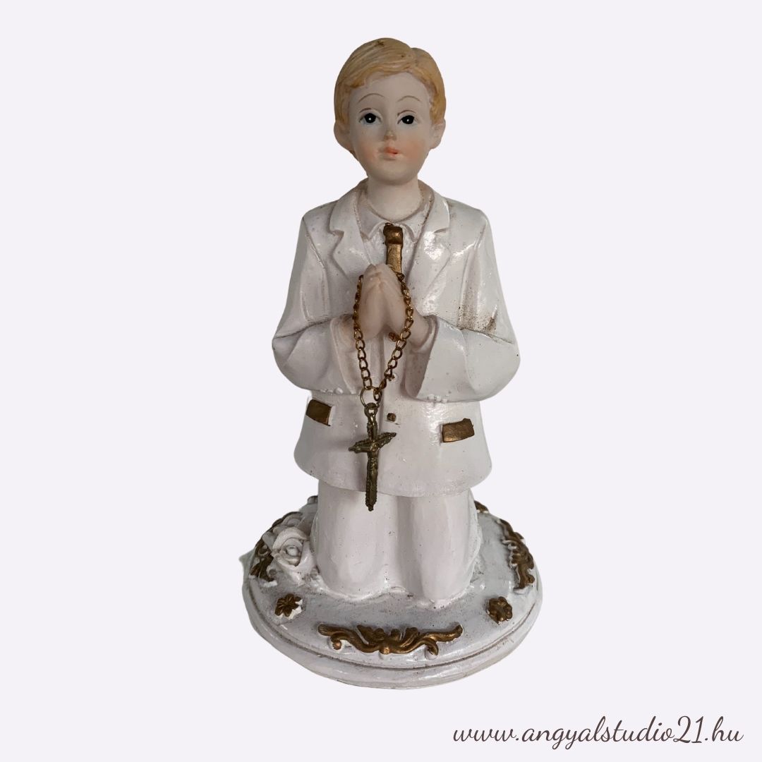 Fehér színű elsőáldozó kisfiú szobor, 14 cm magas.