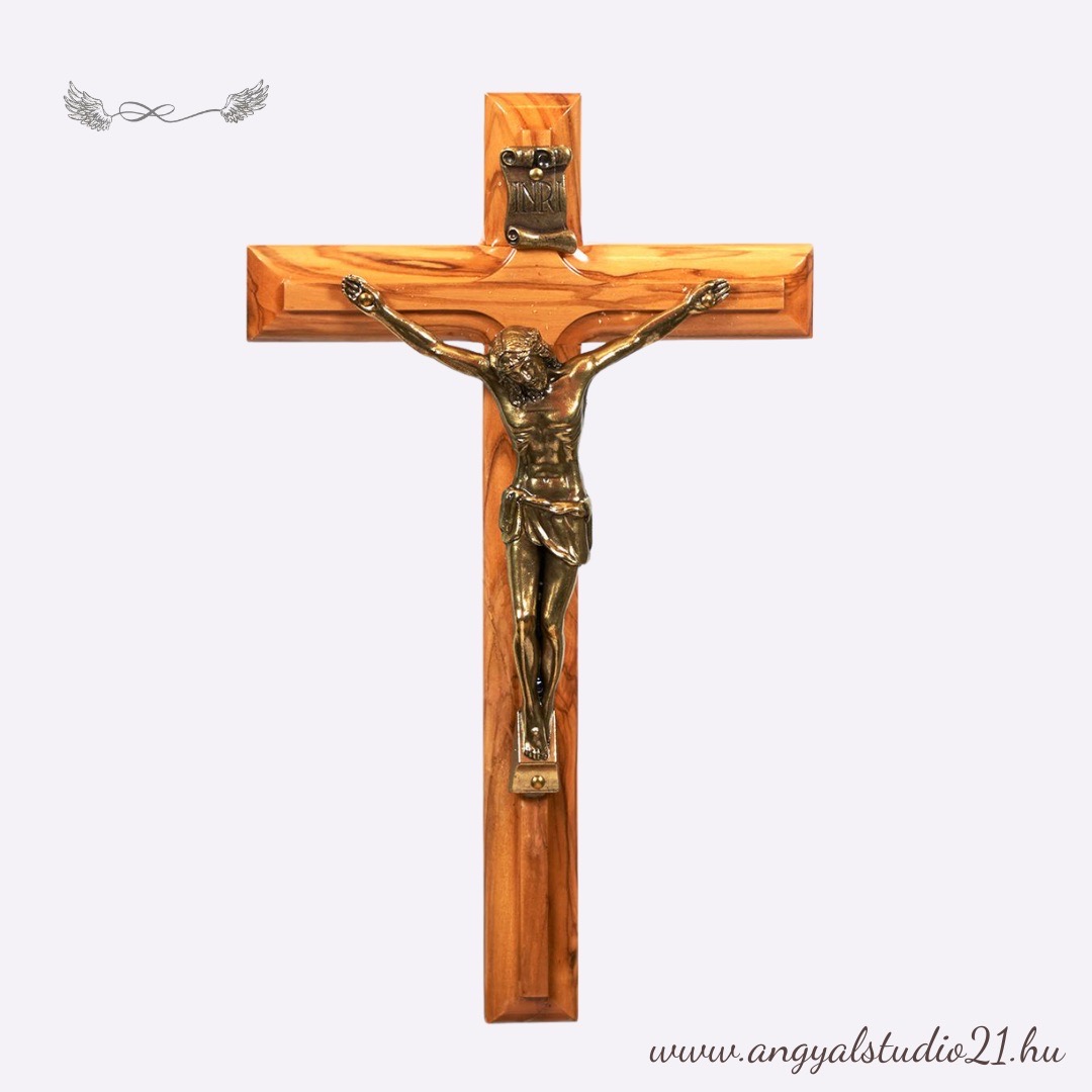 25 cm-es, falra akasztható feszület olívafából, bronzszínű korpusszal.
