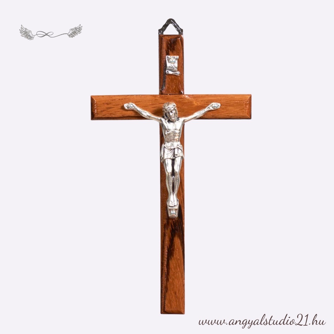 17 cm-es, falra akasztható feszület zebranofából (zebrafa),ezüstszínű korpusszal.