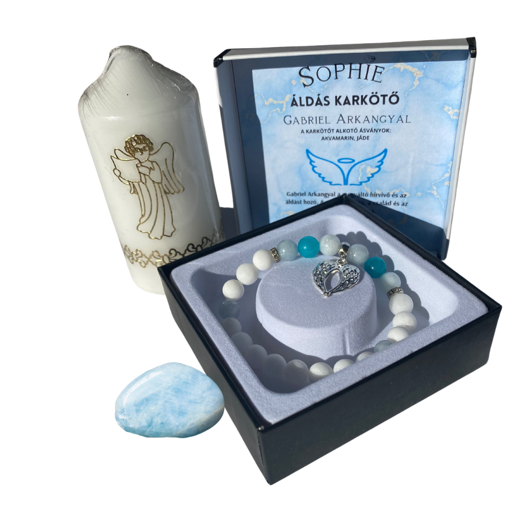 – Egy különleges ásványkarkötő: akvamarin és fehér jade kombinációja, amelyek segítenek a kommunikációban és az intuíció fejlesztésében.