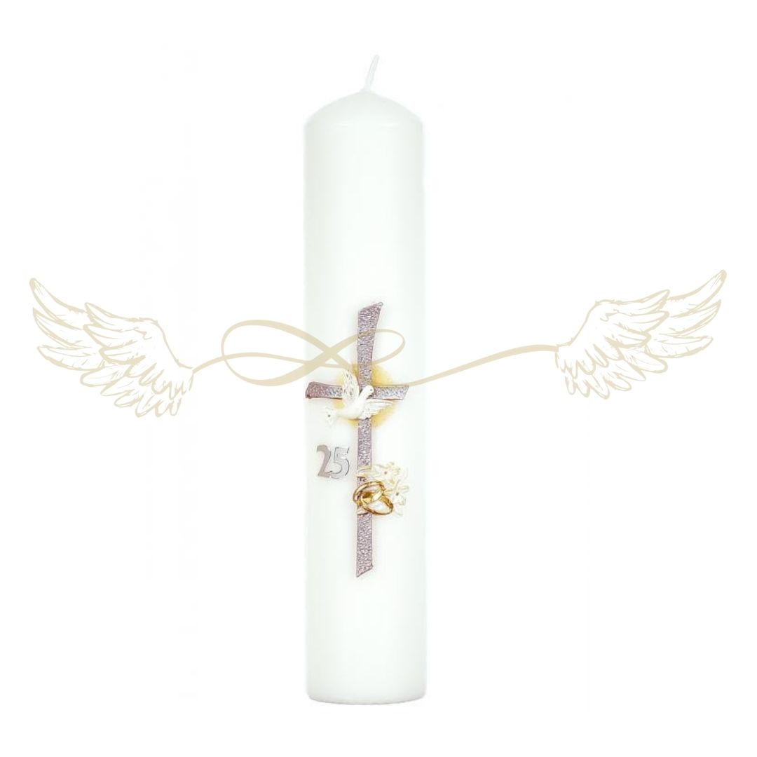 Exkluzív, álló, fém feszület két gyertyatartóval, ezüst színben, díszdobozban