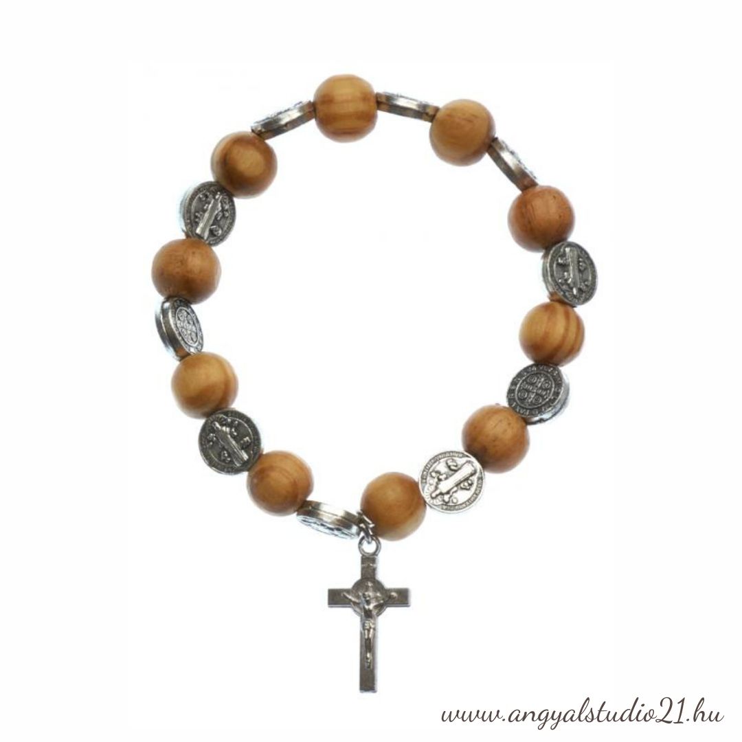 A barna gumis fa karkötő 10 db fa gyögyből és 10 db ezüst színű Szent Benedek éremből áll. A karkötőn egy ezüst színű Szent Benedek érem lóg. A fa gyöngyök mérete 8 mm.