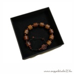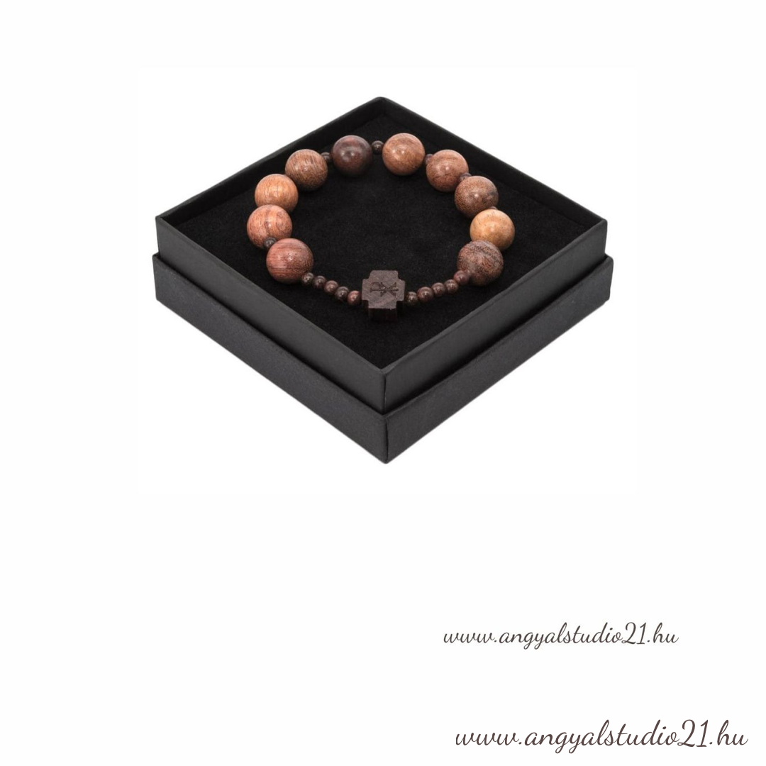 A barna, burmai padauk fa, gumis karkötő 10 db 10 mm átmérőjű padaukfa gyöngyből, 19 db apró padauk fa gyöngyből és 1 db padauk fa keresztből áll.