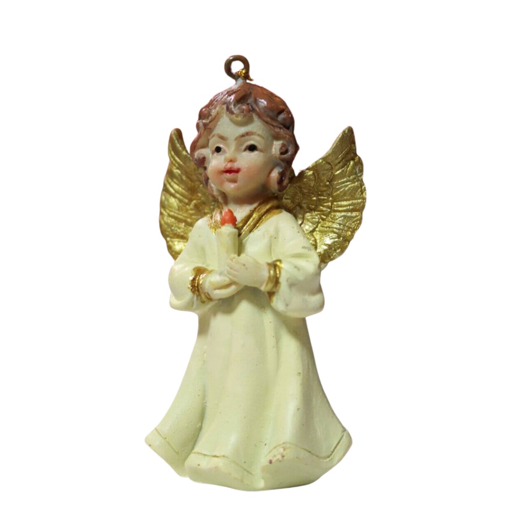 Mesebeli, krém és arany színű, felfüggeszthető angyal karácsonyfadísz – gyertyával a kezében. A dísznek van egy arany zsinege, amire felfüggeszthető.