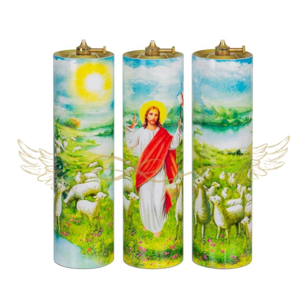 3 db 26 cm magas, 7,5 cm átmérőjű kék színű olajgyertyák, húsvéti díszítéssel. Az olajgyertyákban az olajtartály állítható kanócos. Az olajgyertya és a tartály műanyagból, a tartály fedele fémből készült. A kanóc állíthatósága lehetővé teszi a láng szabályozását.